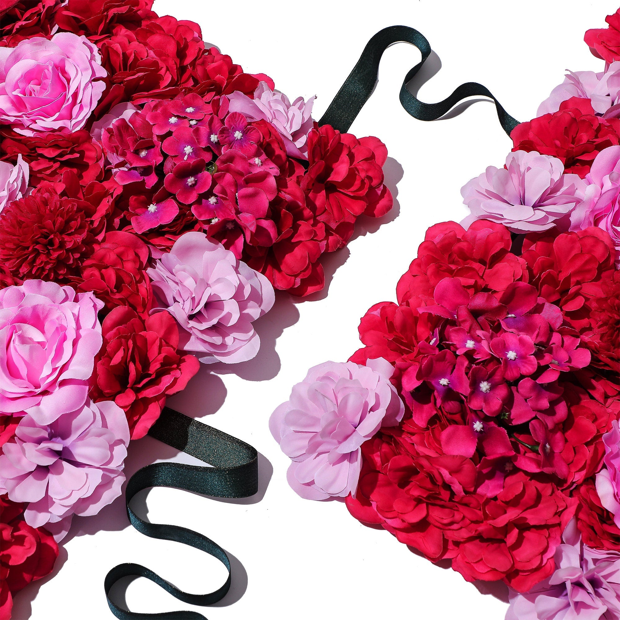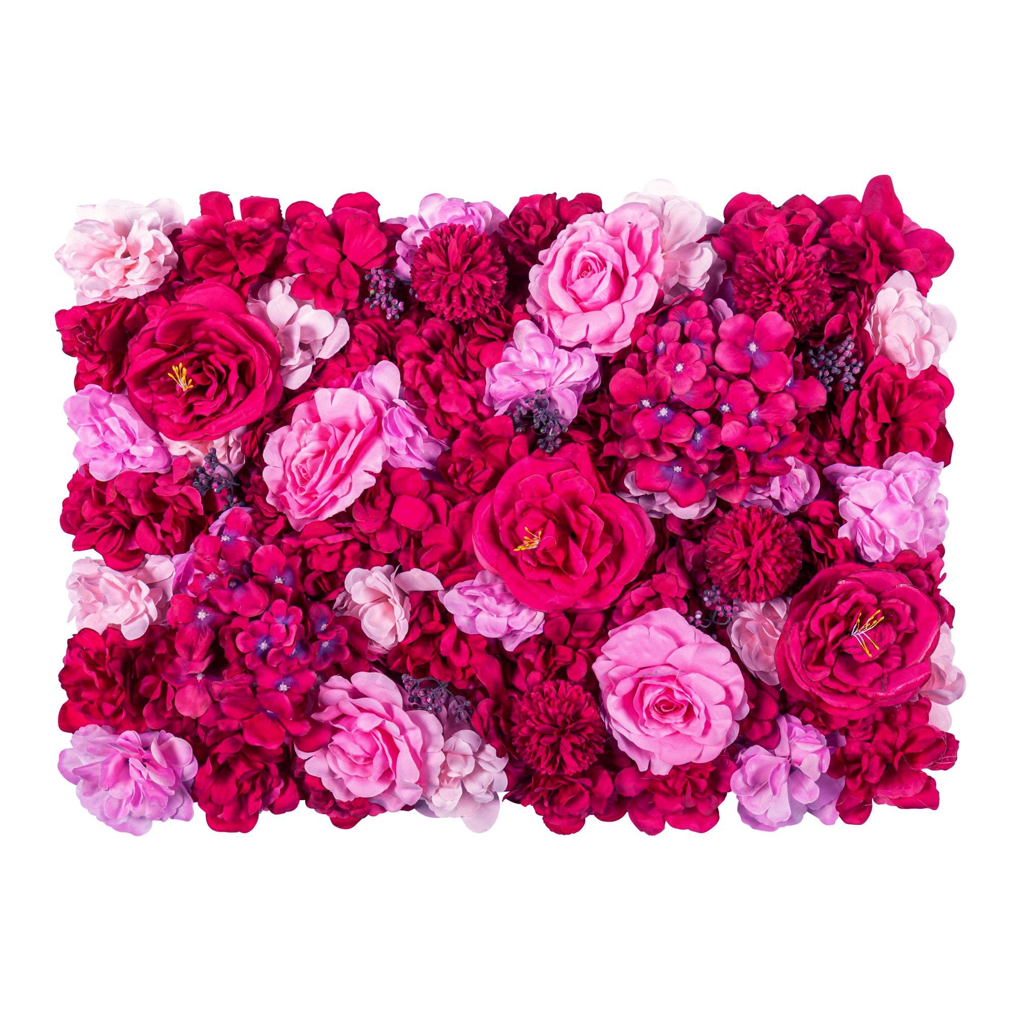 A: Each of our flower and greenery panels are 16in x 24in. For example, if you "Select a Size" and choose the 4 panels option, you will receive four 16”x24” pieces that can be arranged into a 32”x48” wall.