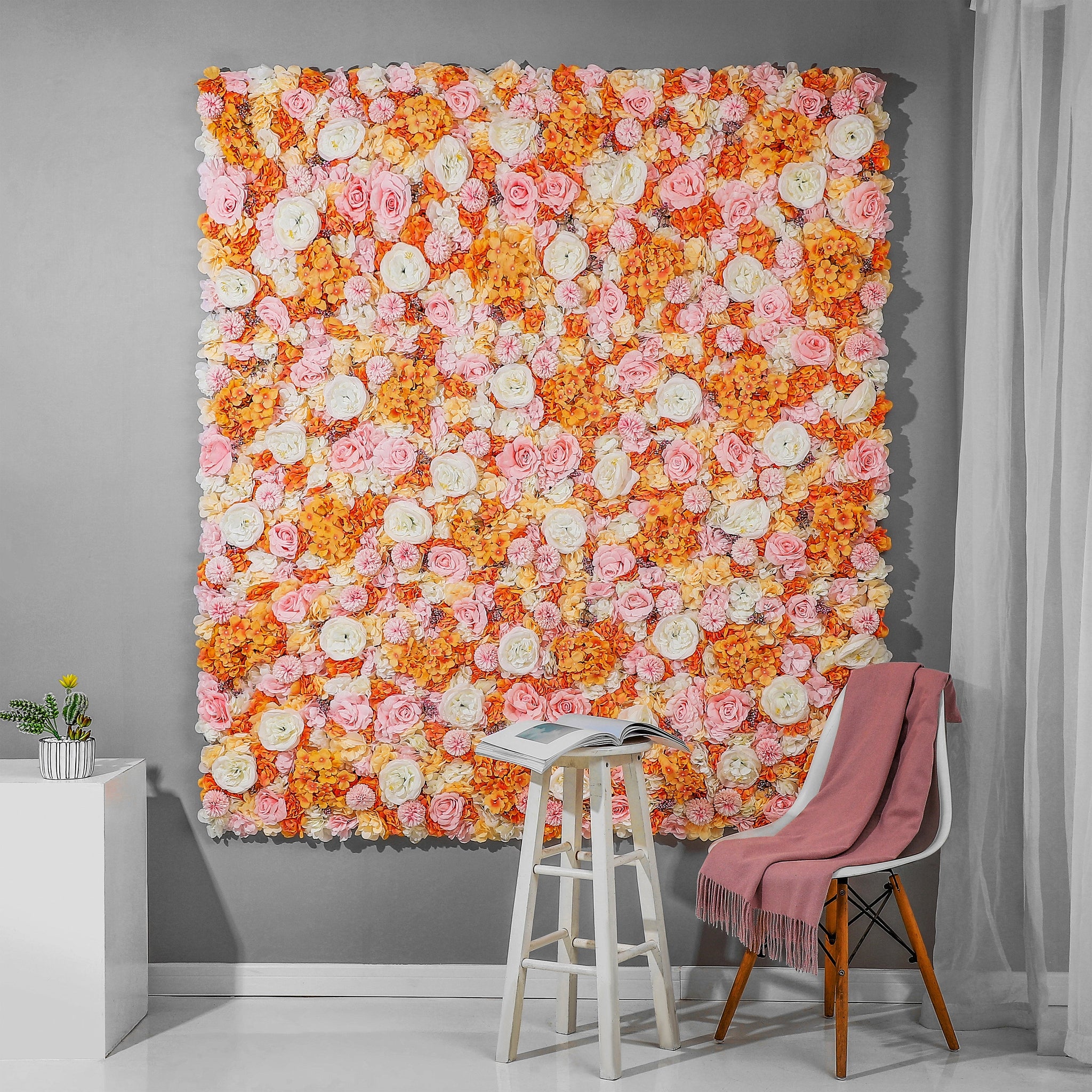 A: You can nail or command hook (be sure to use enough to distribute the weight!) this to a wall, or use a backdrop stand. We suggest a backdrop stand that does not have tripod legs, as these will peek out from other side of the flower wall. You can zip-tie all panels first, then use s-hooks at the top to hang onto the crossbar of a backdrop stand.